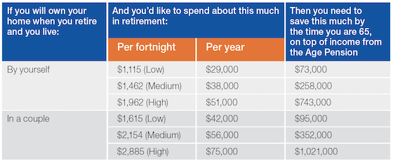 ASFA estimates a single retiree will need to save $545,000 to live comfortably on annual income of $46,494 a year, while retired couples will need $640,000 to generate annual income of $65,445. This also assumes you own your home outright and will be eligible for the Age Pension.
