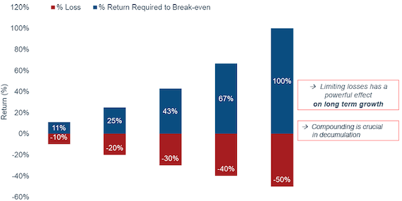While the effects of compounding and dollar cost averaging are positive for savings and accumulation, the opposite is true during decumulation. In fact, limiting losses in retirement has a more powerful effect on long-term growth than capturing the full upside of market gains.