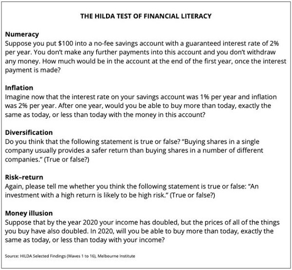The 2018 Household, Income and Labour Dynamics in Australia (HILDA) Survey, conducted by the University of Melbourne’s Melbourne Institute, provides a comprehensive objective snapshot (as opposed to a subjective self-rated assessment) of Australians’ financial literacy by asking five questions about basic financial concepts (see box for the questions).