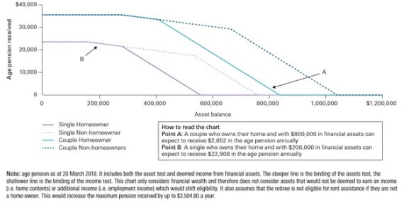 On a basic level, the lower your assets and income, the more age pension you will be entitled to as its role as a safety net kicks in up to the maximum amount of $843.60 a fortnight for a single pensioner and $635.90 each for a couple, as at March 2019.