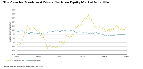As a diversifier to equities – bonds dampen overall portfolio volatility when held in a portfolio with riskier assets such as equities;